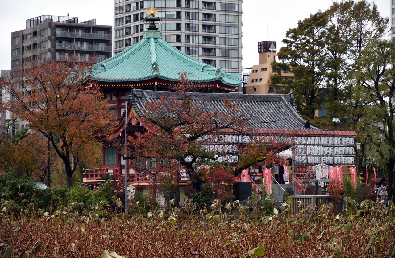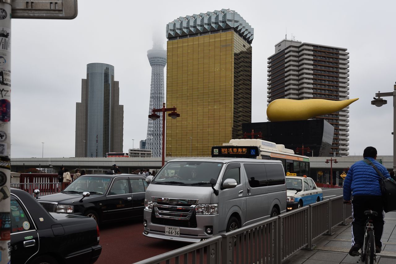 Das KIRIN Gebäude (Bronze). Die Dachskulptur und das Gebilde rechts daneben symbolisieren den Bierschaum. Links davon der neue Tokyo Tower